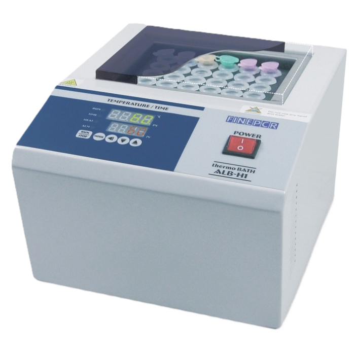 The FinePCR ALB-H1 dry block heater is designed for accurate and stable heating of laboratory samples without the use of water or oil. The instrument features a digital microprocessor PID controller that ensures precise temperature control and excellent thermal stability across the heating block.